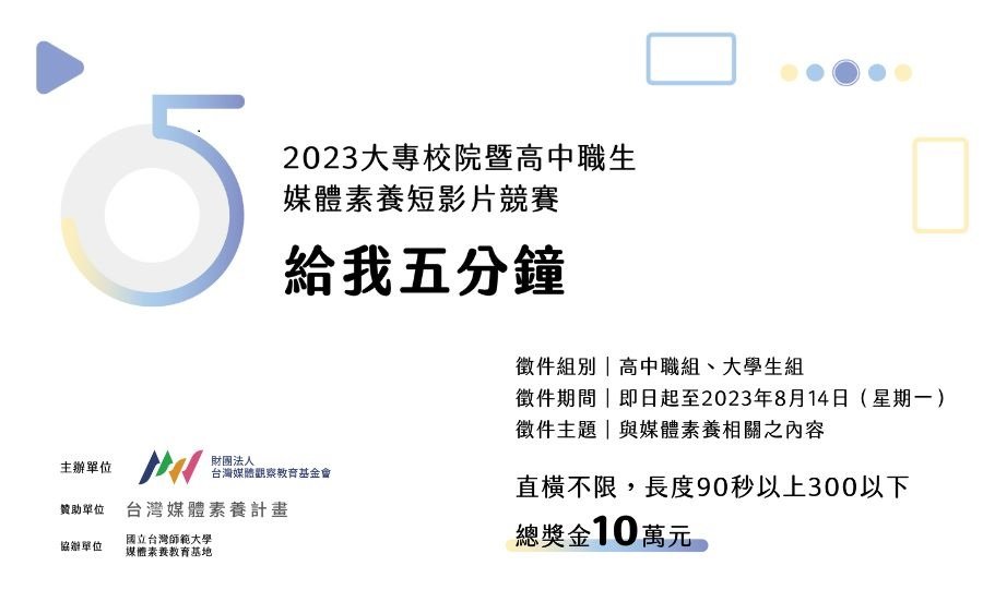 活動名稱:總獎金10萬!2023大專校院暨高中職生媒體素養短影片競賽「給我五分鐘」