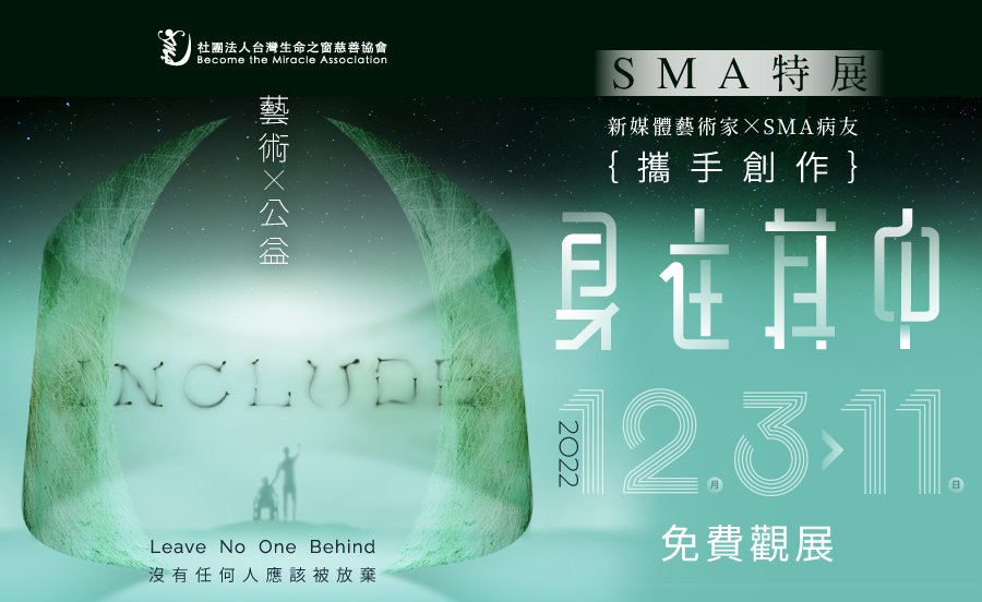 「身在其中-INCLUDE」Leave No One Behind目的是藉由視覺與新媒體藝術的展演,呈現在社會倫理的光譜中,罕見疾病族群的堅毅、困境與掙扎。將人性中寶貴的仁愛精神,透過視覺與聽覺的藝術感受,喚起大眾對『SMA 生命權』議題的關注,進而產生更多的同理心,以行動支持社群中微弱的聲音、攜手撫平障礙、綻放出群體的良善光芒,期待為病友爭取醫療的權益與改善生活品質。