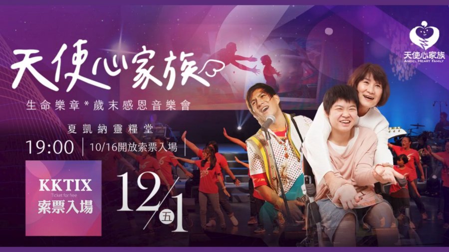 活動宗旨:天使心家族-生命樂章歲末感恩音樂會」12/1(五)19:00在夏凱納靈糧堂舉行,邀請您一起來,用實際的行動支持發展遲緩族群—「愛奇兒家庭」。